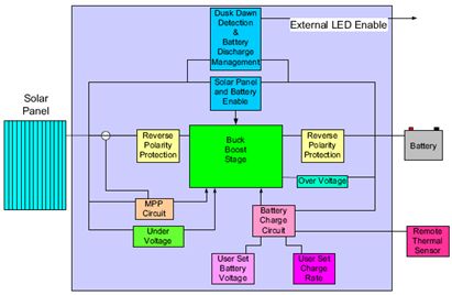 設(shè)計(jì)工作包括根據(jù)功率需求的增加隔離拓?fù)浣Y(jié)構(gòu)。電池充電狀態(tài)的管理是由適當(dāng)?shù)某潆娝惴ㄍ瓿傻?。太陽能電池板安裝技師可以選擇輸出電壓和電池充電速率。由于控制器要連接到太陽能電池板,它必須具有最大功率點(diǎn)跟蹤,為最終客戶提供高價(jià)值??刂破饔袃蓚€(gè)正使能(Enable)電路,一個(gè)電路檢測黑夜時(shí)間,另一個(gè)檢測電池的充電狀態(tài),使外部電路不會(huì)使電池對損壞點(diǎn)放電。由于控制器將由不同程度經(jīng)驗(yàn)的現(xiàn)場技術(shù)人員和新手安裝,因此重要的是輸入和輸出必須有反向極性保護(hù)。另外,控制器和電池可能安裝在過熱或過冷的位置,控制器必須采用電池充電溫度補(bǔ)償。設(shè)計(jì)還應(yīng)包括安全功能,如電池過壓檢測和太陽能電池板欠壓檢測。