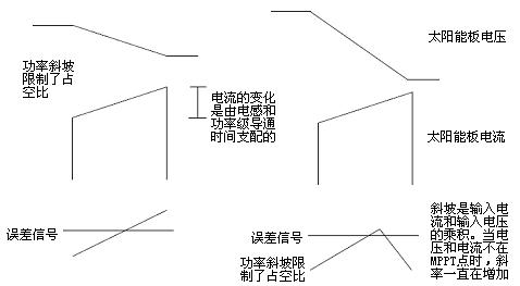 為了從功率可變的電源(即太陽能電池板)析取出最大的功率,太陽能控制器必須采用MPPT。MPPT必須首先找到最大功率點(diǎn)并及時(shí)調(diào)整環(huán)境條件,以保持控制器接近最大功率點(diǎn)。動(dòng)態(tài)MPPT用在系統(tǒng)發(fā)生改變的情況下。由于每個(gè)開關(guān)周期都在發(fā)生變化,太陽能電池板汲取的功率也會(huì)在每個(gè)周期有明顯的改變。動(dòng)態(tài)MPPT利用太陽能電池板的電壓驟降乘以每個(gè)開關(guān)周期增加的電流,以確定將要產(chǎn)生的誤差信號來調(diào)節(jié)占空比。動(dòng)態(tài)響應(yīng)可檢測IV曲線的斜率,從而建立一個(gè)功率斜坡,從誤差信號相交點(diǎn)建立一個(gè)代表占空比的功率。當(dāng)斜坡變化斜率從正到負(fù)時(shí)該周期結(jié)束,如圖2所示。