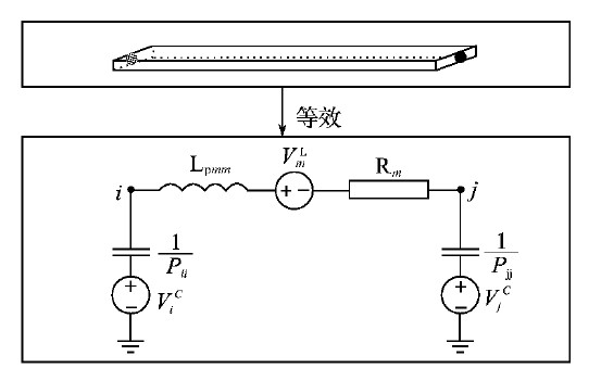 J.Ekman提出了基于寄生參數(shù)矩陣的等效電路的建立方法,即把所有互感、互容等效成受控的電壓源,與自感、自容連接(相當(dāng)于把所有互感、互容對(duì)電路的影響等效到受控電壓源上),從而建立等效電路模型。圖4所示為任意兩個(gè)節(jié)點(diǎn)間的等效電路模型。
