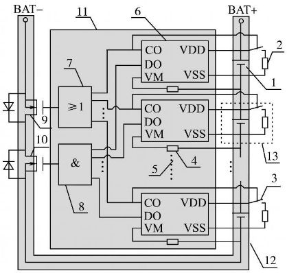 采用單節(jié)鋰電池保護芯片設(shè)計的具備均衡充電能力的鋰電池組保護板示意圖如圖1所示。其中:1為單節(jié)鋰離子電池;2為充電過電壓分流放電支路電阻;3為分流放電支路控制用開關(guān)器件;4為過流檢測保護電阻;5為省略的鋰電池保護芯片及電路連接部分;6為單節(jié)鋰電池保護芯片(一般包括充電控制引腳CO,放電控制引腳DO,放電過電流及短路檢測引腳VM,電池正端VDD,電池負(fù)端VSS等);7為充電過電壓保護信號經(jīng)光耦隔離后形成并聯(lián)關(guān)系驅(qū)動主電路中充電控制用MOS管柵極;8為放電欠電壓、過流、短路保護信號經(jīng)光耦隔離后形成串聯(lián)關(guān)系驅(qū)動主電路中放電控制用MOS管柵極;9為充電控制開關(guān)器件;10為放電控制開關(guān)器件;11為控制電路;12為主電路;13為分流放電支路。單節(jié)鋰電池保護芯片數(shù)目依據(jù)鋰電池組電池數(shù)目確定,串聯(lián)使用,分別對所對應(yīng)單節(jié)鋰電池的充放電、過流、短路狀態(tài)進行保護。該系統(tǒng)在充電保護的同時,通過保護芯片控制分流放電支路開關(guān)器件的通斷實現(xiàn)均衡充電,該方案有別于傳統(tǒng)的在充電器端實現(xiàn)均衡充電的做法,降低了鋰電池組充電器設(shè)計應(yīng)用的成本。