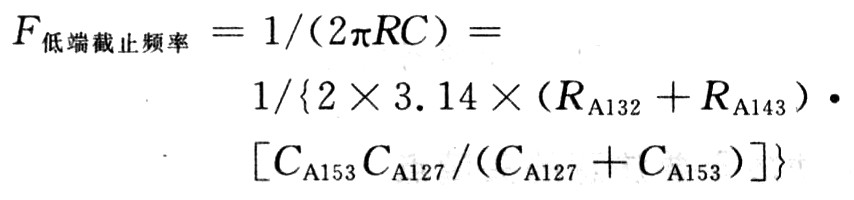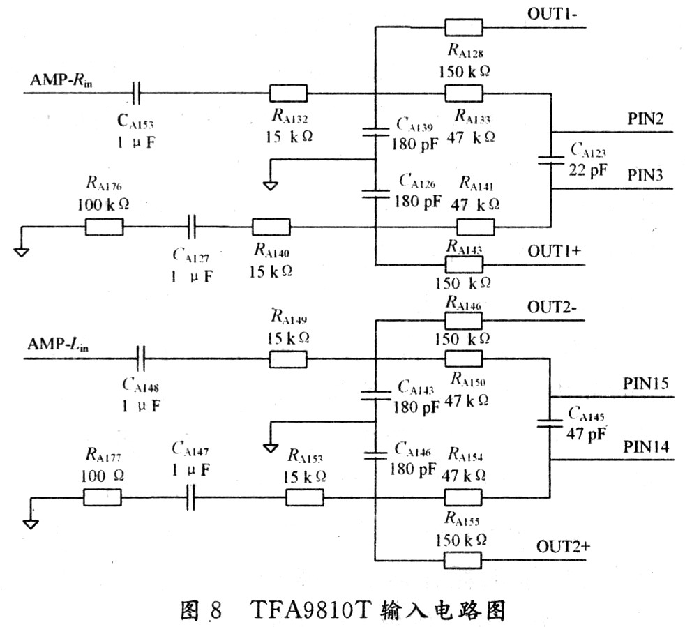 TFA9810T輸入端采用可抑制共模干擾的全差分輸入電路。以圖8 AMP-Rin輸入端為例,RA128/RA133/CA139構(gòu)成負反饋低通濾波器,用于衰減反饋信號中高頻載波成分。增加低頻成分反饋量,特別是直流成分。有效改善了零輸入時因輸入信號直流電平與比較器門限電壓差異形成的占空比誤差,調(diào)整RA128也可實現(xiàn)TFA9810T增益控制,使Au(dB)=20log(VOUT/VIN)≌20log(RA128/RA132)。器件CA153/RA132/RA133及TFA9810T內(nèi)阻構(gòu)成高通濾波器,用于對輸入信號的緩沖。若CA153容值過小,會影響低頻響應,理論確定公式為: