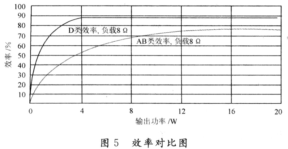 由上述公式得知,D類功放中負載RL,相對其他電阻,比值越大效率越高;MOSFET作為續(xù)流開關(guān),所消耗的功率幾乎等于MOSFET導通阻抗上I2RON損耗和靜態(tài)電流總和,相比較輸出到負載的功率幾乎可忽略。所以,其效率遠高于線性功放,如圖5所示。非常適應現(xiàn)今綠色節(jié)能的要求,適合被平板等數(shù)字視聽產(chǎn)品規(guī)模使用。