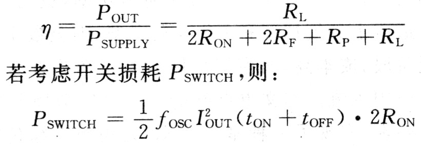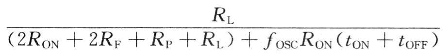 假設D類功放MOSFET導通電阻為RON,所有其他無源電阻為RP,濾波器電阻為RF,負載電阻為RL,則不考慮開關(guān)損耗的效率為: