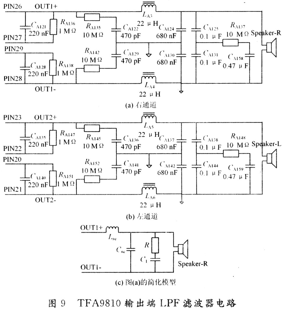 TFA9810T輸出端低通濾波器采用二階巴特沃思濾波器方式,實際的巴特沃思二階濾波器由圖9中RCA類電子元器件CA135/RA145/CA136/LA5/CA137/CA138/RA148/CA159/CA140/CA141/RA152/LA6/CA142/CA144等構(gòu)成,對PWM方波中15 Hz~20 kHz音頻成分表現(xiàn)為直通效應,對超過音頻范圍的20 kHz以上高頻成分呈現(xiàn)-12 dB/倍頻程滾降率。