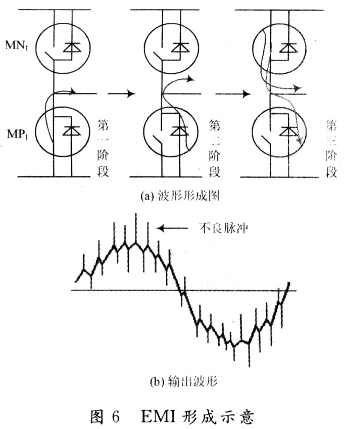 (1)輸出信號中將產(chǎn)生毛刺,造成電磁干擾,也即死區(qū)時間內(nèi),IN1/IN3都關(guān)斷。完全失控的輸出電壓將受到圖6(a)中體二極管電流的影響(體二極管電流的形成,參見下文EMI節(jié)),輸出波形中將出現(xiàn)毛刺干擾。
