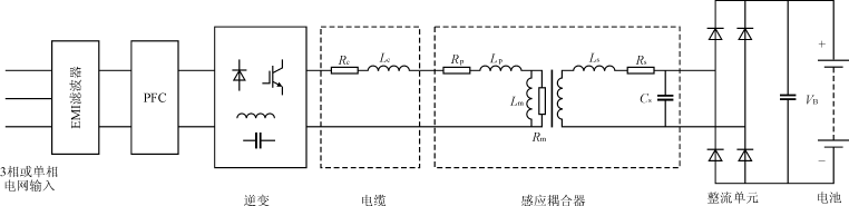 圖2給出電動汽車感應耦合充電系統(tǒng)的簡化功率流圖。圖中,輸入電網交流電經過整流后,通過高頻逆變環(huán)節(jié),經電纜傳輸通過感應耦合器后,傳送到電動汽車輸入端,再經過整流濾波環(huán)節(jié),給電動汽車車載蓄電池充電。