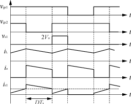 當原邊開關管S1及S2均開通時,能量儲存在輸入濾波電感中,同時輸出整流管處于關斷態(tài)。當開關管S1及S2中任一個開關管關斷時,儲存能量通過原邊繞組傳輸?shù)礁边?。由于變換器的對稱工作,變壓器磁通得以復位平衡。