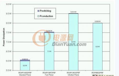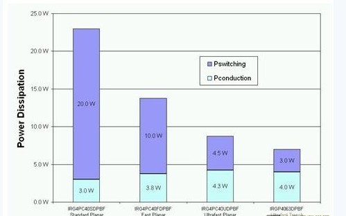 前文討論了高壓側(cè) IGBT在20kHz或以上頻率進(jìn)行切換。假設(shè)設(shè)計(jì)一個(gè)擁有230V交流輸出的1.5kW 太陽能逆變器,表1中哪種IGBT具有最低的功耗呢?圖4顯示了IGBT在20kHz進(jìn)行切換的功耗分析,由此可見超速平面式IGBT比其它兩種平面式 IGBT具有更低的總功耗。