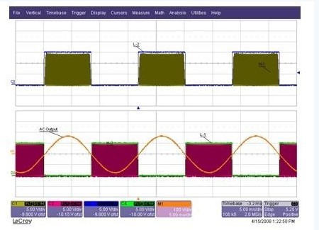 脈寬調(diào)制這些IGBT的最佳方法是什么?怎樣才能把功耗降到最低呢?方法之一是僅對高壓側(cè)IGBT進(jìn)行脈寬調(diào)制,對應(yīng)的低壓側(cè)IGBT以50Hz或60Hz換相。圖2所示為一個(gè)典型的柵壓信號。當(dāng)Q1 正進(jìn)行脈寬調(diào)制時(shí),Q4維持正半周期操作。Q2和Q3在正半周期保持關(guān)斷 。到了負(fù)半周期,當(dāng)Q3進(jìn)行脈寬調(diào)制時(shí),Q2保持開啟狀態(tài)。Q1和Q4會在負(fù)半周期關(guān)斷。圖2 也顯示了通過輸出濾波電容器C1的AC正弦電壓波形。