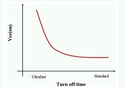 IGBT基本上是具備金屬門氧化物門結(jié)構(gòu)的雙極型晶體管 (BJT) 。這種設(shè)計(jì)讓IGBT的柵極可以像MOSFET一樣,以電壓代替電流來控制開關(guān)。作為一種BJT,IGBT的電流處理能力比MOSFET更高。同時(shí),IGBT亦如BJT一樣是一種少數(shù)載體元件。這意味著 IGBT關(guān)閉的速度是由少數(shù)載體復(fù)合的速度快慢來決定。此外,IGBT的關(guān)閉時(shí)間與它的集極-射極飽和電壓 (Vce(on)) 成反比(如圖3所示)。