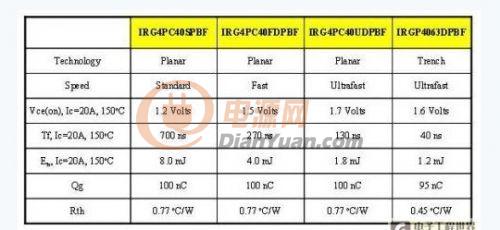 表1顯示了四個(gè)擁有相同尺寸的IGBT的參數(shù)值。前三個(gè)IGBT采用同樣的平面式技術(shù),但使用不同的壽命復(fù)合控制計(jì)量。從表中可見,標(biāo)準(zhǔn)速度的IGBT具有最低Vce(on) ,但與快速和超速平面式IGBT相比,標(biāo)準(zhǔn)速度的IGBT下降時(shí)間最慢。第四個(gè)IGBT是經(jīng)優(yōu)化的槽柵IGBT,能夠?yàn)樘柲苣孀兤鬟@類高頻率切換應(yīng)用提供低導(dǎo)通和開關(guān)損耗。請注意,槽柵IGBT的Vce(on) 和總切換損耗 (Ets) 比超速平面式IGBT低。