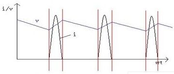 一般開關(guān)電源為容式濾波,在輸入與整流濾波部分電磁噪聲主要是由整流過程中造成的電流尖峰、電壓波動所引起的。正弦波電源經(jīng)過電源濾波器進行差模、共模信號衰減后,由整流橋整流、電解電容濾波,得到的電壓作為高頻逆變部分的輸入電壓。由于濾波電容的存在,使整流器不象純整流那樣一組開通半個周期,而是只在正弦電壓高于電容電壓時才導(dǎo)通,造成電流波形非常陡峭,同時電壓波形變得平緩。電流、電壓的波形如圖2所示。