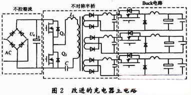 改進的新型充電器主電路,如圖2所示。前級采用軟開關(guān)不對稱半橋?qū)崿F(xiàn)了多路的隔離輸出,并且利用自身產(chǎn)生的寄生參數(shù),實現(xiàn)諧振式零電壓軟開關(guān)以此減小開關(guān)的損耗,同時也避免了因變壓器漏感而帶來的電壓尖峰。后級采用成熟簡單的Buck電路拓撲,實現(xiàn)降壓并用此來滿足三段式充電的要求。