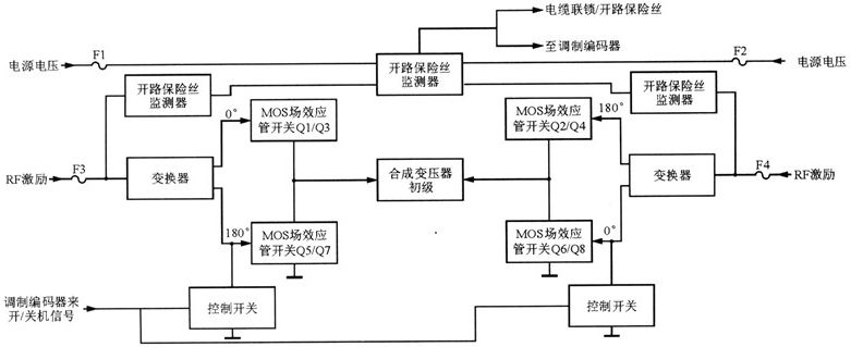 在射頻功放模塊的設計中,兩個半橋式組態(tài)采用單獨的電源和射頻激勵輸入,這樣可以使每個放大器兩個半橋獨立地進行工作。如將Q1/Q3源極和QS/Q7的漏極接在一起,射頻輸出從0V到+V,則可保證當一個全橋組態(tài)的射頻功放模塊在任何一個半橋出現(xiàn)故障時,射頻功放模塊仍然可以工作。只是射頻輸出電壓減小為全橋組態(tài)的一半而已。