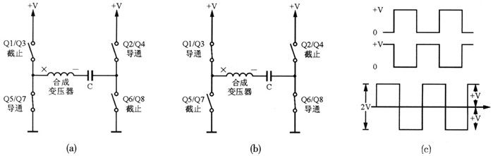 在射頻周期的負半周,Ql/Q3和Q6/Q8處于截止狀態(tài),相當于開關斷開;Q2/Q4和QS/Q7則是飽和導通的,相當于開關接通。Q2/Q4和QS/Q7串聯(lián)導通電源電壓為+V,若忽略MOS管的飽和壓降,+V將全部降落在合成變壓器上。在射頻周期的正半周,Q1/Q3和Q6/Q8處于導通狀態(tài),Q2/Q4和QS/Q7為截止狀態(tài)。Ql/Q3和Q6/Q8串聯(lián)導通電源電壓+V,+V全部降落在合成變壓器上。由圖4可見,合成變壓器初級電壓方波輸出相差180°,說明輸出電壓的峰峰值為+2V。MOS開關的作用就是有效地將整個電源電壓跨接在合成變壓器的初級繞組上,在射頻激勵信號的每半個周期是反相的。作為全橋組態(tài),輸出就是兩倍電源電壓的射頻輸出。為了防止直流電壓通過變壓器的繞組通地,應在每部分的射頻輸出都串聯(lián)有隔直電容C。