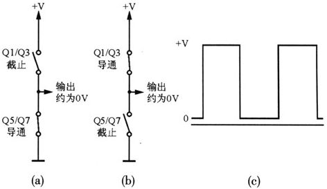 在射頻激勵信號的負半周,MOS管QI/Q3截止,QS/Q7導通,如圖5(a)所示。而在射頻激勵輸入信號的正半周,MOS管Q1/Q3導通,QS/Q7截止,如圖5(b)所示。Q2/Q4和Q6/Q8的開關情況與此正好相反??缭诠β屎铣勺儔浩鞒跫墐啥说妮敵鲂盘柧驮诎雮€周期里,在地(約為0V)和正電源間進行一次切換,如圖5(c)所示。