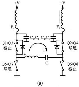 因為在用的功放模塊產生的射頻電流必須流過合成變壓器的次級,并在已關斷的射頻功放模塊的初級繞組上感應出射頻電壓。根據(jù)楞次定律,變壓器次級電流所產生的磁通總是試圖抵消初級電流所產生的磁通,所以,流過關斷功放輸出變壓器次級的電流感應到初級的電壓后,一定和原來的輸出電壓極性相反。在如圖6(a)所示,由次級電流感應到初級的電壓為左正右負,說明關斷的射頻功放在導通狀態(tài)下的變壓器初級電壓極性是左負右正,與此相對應的導通管為Q2/Q4,截止管為01/Q3,從而形成的低阻抗通路為:與Ql/Q3相并聯(lián)的反向二極管→旁路電容C1、C3→旁路電容C2、C4→Q2/Q4→隔直電容C。同理,圖6(b)所形成的低阻抗通路為:與Q2/Q4相并聯(lián)的反向二極管→旁路電容C2、C4→旁路電容C1、C3→Q1/Q3。