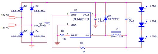 CAT4201驅(qū)動器的優(yōu)勢是緊湊的電路和高能效,使得它非常適合替代基于燈絲的燈泡,如射燈應(yīng)用。這款超小設(shè)計(jì)可以放進(jìn)MR16型LED射燈的標(biāo)準(zhǔn)連接器(燈座)空間內(nèi),將這些對溫度敏感的元件與發(fā)熱的LED盡量分隔開。
