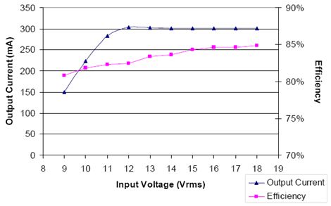 在電路配置方面,VBAT的額定電壓為-0.3至+40 V,因此整流橋上的輸入電壓高達(dá)24 Vac也是安全的。要保持較高輸入電壓水平就需要一個大容量的C1。大幅波動的經(jīng)整流的AC電流將在雙倍AC線路頻率條件下把輸出電流拉至零,因此減少了輸出電流。220 μF的電容對這個設(shè)計(jì)已經(jīng)足夠了。對于12 Vac輸入,C1額定電壓應(yīng)該是25 V。由于需要較低的正向電壓,整流橋選用了MBR0520L表面貼裝肖特基二極管。