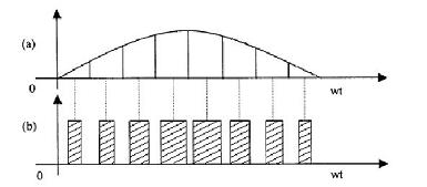 在采樣控制理論中有一個重要的結(jié)論:沖量相等而形狀不同的窄脈沖加在具有慣性的環(huán)節(jié)上,其效果基本相同。沖量指窄脈沖的面積。效果基本相同指環(huán)節(jié)的輸出響應(yīng)波形基本相同。如把各輸出波形用傅氏變換分析,則其低頻特性非常接近,僅在高頻段略有差異。這一結(jié)論是PWM控制的重要理論基礎(chǔ)。如圖1(a)所示,將正弦半波看成由N 個彼此相聯(lián)的脈沖組成的波形。這些脈沖寬度相等,但幅度不等,且脈沖的頂部為曲線,各脈沖的幅值按正弦規(guī)律變化。如果將上述脈沖序列用同樣數(shù)量的等幅不等寬的矩形脈沖序列代替,使矩形脈沖的中點(diǎn)和相應(yīng)正弦波部分的中點(diǎn)重合,且使矩形脈沖和相應(yīng)的正弦波部分面積相等,就得到圖1(b)所示的脈沖序列。像這種脈沖寬度按正弦規(guī)律變化而和正弦波等效的波形即為SPWM波形。