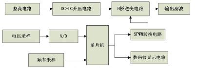 本設(shè)計包括單片機(jī)最小系統(tǒng)、整流及電源電路、DC-DC 升壓電路、SPWM 轉(zhuǎn)換電路、H 橋逆變電路等幾個模塊,由于系統(tǒng)需要完成輸出電壓和頻率的檢測和顯示,因此需要設(shè)計電壓、頻率采樣電路、A/D 轉(zhuǎn)換電路、數(shù)碼管顯示電路等。系統(tǒng)的總體設(shè)計框圖如圖3 所示。