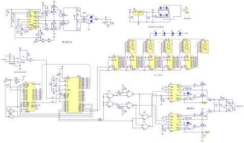 本系統(tǒng)設(shè)計的交流穩(wěn)壓電源的原理圖如圖6 所示,原理圖中包括了單片機(jī)最小系統(tǒng)設(shè)計、DC-DC升壓電路、SPWM轉(zhuǎn)換電路、H 橋驅(qū)動電路及頻率的采樣和顯示電路。