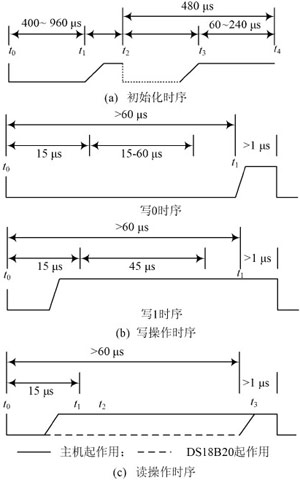 (1)初始化時(shí)序。時(shí)序見(jiàn)圖2(a),主機(jī)總線t0時(shí)刻發(fā)送一復(fù)位脈沖(最短為480s的低電平信號(hào))接著在t1時(shí)刻釋放總線并進(jìn)入接收狀態(tài),DS18B20在檢測(cè)到總線的上升沿之后等待15~60μs,接著DS18B20在t2時(shí)刻發(fā)出存在脈沖(低電平持續(xù)60~240s),如圖中虛線所示。