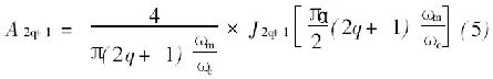 式中, q= 0, 1, 2, ……∝;ω m 是調(diào)制頻率; ωc 是載波頻率; ωm ≤ωc , a是調(diào)制指數(shù); J v ( z) 是第一類Bessel 函數(shù)。公式( 5) 只適用于頻率范圍遠(yuǎn)遠(yuǎn)低于載波頻率, 此時(shí)在一次波段的載波頻率可以忽略不計(jì)。在本文的系統(tǒng)研究中, m / c= 1/ 90 適用于規(guī)定計(jì)算, 并假設(shè)調(diào)制指數(shù):