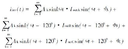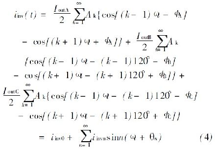 式中, I inv0是直流分量的逆變器輸入電流; I invn 是n 階部分的電流。通過公式( 4) 可看到, I outA = I outB = I outC和ΦA= ΦB= ΦC , 同時(shí)有I invn = 0, 如果n> 0 三相負(fù)載電流是平衡的。否則, 交流成分存在會(huì)造成連鎖反應(yīng)。