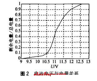 系統(tǒng)工作時間與電池電量成線性關系, 而電量與電池端電壓為非線性關系。圖2 所示為本系統(tǒng)所用電池在2 000 mA 恒流放電的情況下, 電池端電壓與電量的關系曲線, 其中橫軸為電池電壓, 縱軸為剩余電量相對于總電量的百分比。根據(jù)此曲線, 在MCU 軟件中擬合一個電壓與電量關系的數(shù)據(jù)表, 同時設置10 V為告警電壓; 系統(tǒng)可以實時查詢諸如電池電壓、電流、剩余電量、估計供電時間等信息, 并同時仿手機做成3段式顯示, 使上位機全面掌握電池狀態(tài),決定控制策略, 從而提高系統(tǒng)運行可靠性。MCU 軟件使用KeiluV2 軟件開發(fā), 上位機軟件使用LabWindow s 軟件開發(fā)。MCU 除完成電量查詢相關功能, 還要完成報警與顯示功能; 上位機軟件同時要完成環(huán)境參數(shù)的相關采集與處理。