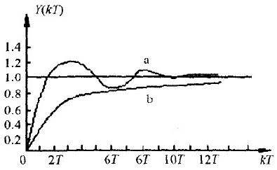 恒偏差法和有效偏差法相類似。有效偏差法又叫逆算法。即當控制量Uk越限時,Uk取邊界值Umax或Umin.由該邊界值逆算出偏差值Ek''代替原來的偏差值Ek.然而,在恒偏差法中,是用經(jīng)過衰減后的Ek''去代替Ek.系統(tǒng)在階躍響應時,實際工作在過阻尼狀態(tài),從而減緩了在起、停時對主電路器件的沖擊。圖3示出兩種算法的階躍輸入響應曲線。其中曲線(a)標準PI算法響應曲線、曲線(b)恒偏差法響應曲線。