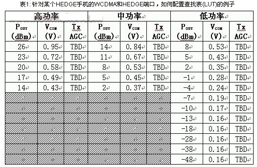 表1所示為針對某個(gè)HEDGE手機(jī)的WCDMA和HEDGE端口,如何配置查找表(LUT)的例子。該表格針對Avago的3G功率放大器,分為高、中和低功率模式三個(gè)主要部分。其它功率放大器因結(jié)構(gòu)不同而具有不同的設(shè)置。高、中和低功率模式分區(qū)下各列內(nèi)容為該模式下的輸出功率及其相應(yīng)的VCON 電壓,這些電壓是基帶處理器生成的電壓,通知FAN5904為功率放大器提供正確的輸出電壓,獲得特定的輸出功率。GSM和EDGE則需要不同的查找表。