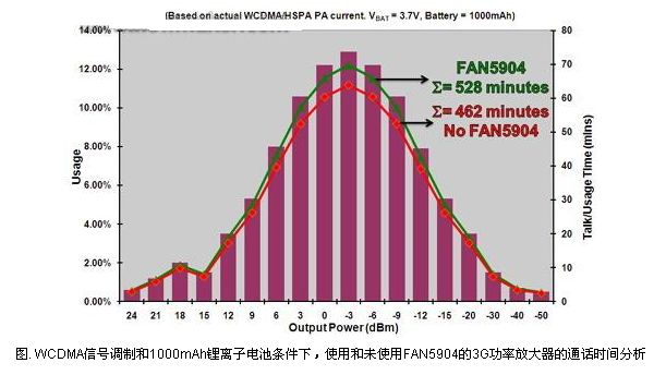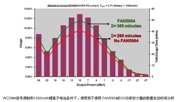 圖1和圖2顯示了在不同輸出功率條件下一個(gè)3G PA分別在語音和數(shù)據(jù)傳輸模式下有、無FAN5904時(shí)所使用的工作時(shí)間的分析。在PA電源電壓設(shè)定在鄰近信道功率比(ACPR)為-39dBc時(shí)的值時(shí), WCDMA的ACPR可以改善到-43dBc,但是電流消耗將會增加,導(dǎo)致效率降低。