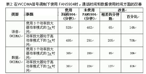 表2顯示了圖1和圖2的結(jié)果,以及功率放大器只工作于高功率模式下相應(yīng)的分鐘數(shù)。在HSUPA、CDMA200 1x EV-DO和TD-SCDMA等不同信號調(diào)制模式下,電流消耗和通話時(shí)間都有類似的改善。這里把高功率模式工作的通話/數(shù)據(jù)使用時(shí)間一起顯示的原因是:新技術(shù)不僅得到了更多的分鐘數(shù),從設(shè)計(jì)角度來看,亦簡化了校準(zhǔn)工作。當(dāng)功率放大器具有多種功率模式時(shí),固件必需適應(yīng)何時(shí)從一個(gè)等級切換到下一個(gè)等級,因?yàn)樵谡麄€(gè)輸出功率范圍內(nèi),每個(gè)功率放大器的每種功率模式都存在獨(dú)特的VPA-POUT 曲線。由于現(xiàn)在大多數(shù)手機(jī)都支持至少三個(gè)頻段,這意味著滿足要求的系統(tǒng)中可能有三種3G功率放大器,所以增加了復(fù)雜程度。在處于一種功率模式的功率放大器中使用FAN5904,可以消除模式切換帶來的復(fù)雜性,更快地進(jìn)行功率放大器校準(zhǔn),因?yàn)樾枰男?zhǔn)點(diǎn)較少。這樣就縮短了測試/校準(zhǔn)的時(shí)間,并且降低了制造成本,同時(shí)簡化了設(shè)計(jì)過程。