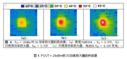 一個(gè)時(shí)常被忽視,但經(jīng)常遭到抱怨的參數(shù)是耗熱問題。在手持電話貼近頭部進(jìn)行通話,使用手機(jī)網(wǎng)上沖浪或者玩在線網(wǎng)絡(luò)游戲時(shí)手機(jī)發(fā)熱,大多數(shù)用戶會因此而感到煩惱。問題的關(guān)鍵在于,設(shè)計(jì)人員在設(shè)計(jì)手機(jī)時(shí)必需將這一因素考慮在內(nèi)。圖4所示為某3G功率放大器的熱成像,其中,(a)為使用FAN5904來供電;(b)為直接與電池連接;(c)為電池以4.2V電壓充電。使用FAN5904時(shí),在滿輸出功率情況下,功率放大器的溫度幾乎不可能達(dá)到50?C,在(b)和(c)的情況下,溫度很容易達(dá)到50?C和65?C,使用一段時(shí)間后,手機(jī)會很快發(fā)熱。在數(shù)據(jù)卡應(yīng)用中,尤其是3G USB調(diào)制解調(diào)器卡開始流行,熱耗散,或者說實(shí)現(xiàn)熱耗散最小化變得十分重要。USB卡不能像手機(jī)那樣有效地散熱,因?yàn)樗捏w積非常小。由于3G調(diào)制解調(diào)器主要用于數(shù)據(jù),功率放大器在大部分時(shí)間運(yùn)行于“發(fā)熱”狀態(tài)。減少這種熱量的最有效方式是使用諸如FAN5904的降壓轉(zhuǎn)換器。