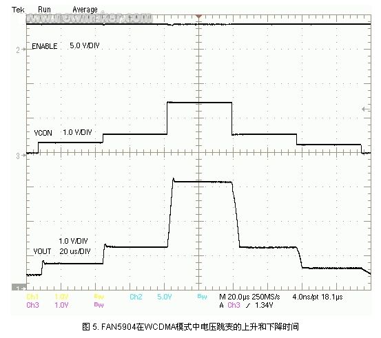 另一個(gè)常常被遺忘的參數(shù)是瞬態(tài)響應(yīng)時(shí)間。當(dāng)需要在不同電壓之間進(jìn)行跳變,以便為功率放大器提供合適的輸出功率時(shí),對各種無線協(xié)議而言,瞬態(tài)響應(yīng)時(shí)間變得尤為重要。FAN5904以6MHz的頻率進(jìn)行切換時(shí),具有非常短的10?s響應(yīng)時(shí)間 (如圖5所示),完全滿足時(shí)隙間隔為25?s的WCDMA規(guī)范和IOPC 6.4.2規(guī)范要求。
