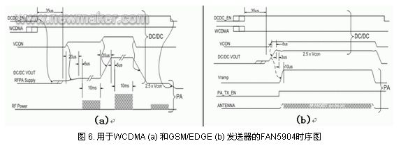 在輸出功率需要從低水平變到高水平,或者從啟動(dòng)開始,瞬態(tài)響應(yīng)時(shí)間為10?s。對于降壓穩(wěn)壓器而言,關(guān)鍵是使功率放大器滿足這些規(guī)范要求,避免出現(xiàn)通話中斷或者通話語音質(zhì)量不良的情況。由于用戶在不同的區(qū)域移動(dòng),信號覆蓋情況或好或壞,雖然如此,通話中斷現(xiàn)象是用戶所不能容忍的。對于GSM/EDGE模式,F(xiàn)AN5904能夠在5?s內(nèi)完成電壓之間的跳變,滿足GSM規(guī)范。圖6所示為用于WCDMA和GSM /EDGE發(fā)送器的FAN5904時(shí)序圖。