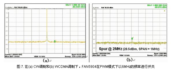 或許在PFM模式下,我們更加關(guān)注的是尖刺會在哪里進(jìn)入信號調(diào)制。通過進(jìn)一步查看圖8(a),在CW模式中,尖刺仍然在-40dBc以下,在8 (b)中,更重要的是該尖刺處于WCDMA調(diào)制遮蔽之下。