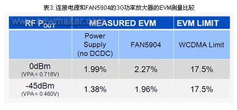 表3列出了所測量的0dBm 和-45dBm (圖8中VPA 值接近VOUT_DCDC )輸出功率的EVM,比較使用電源和FAN5904為3G功率放大器供電的情況。兩列數(shù)值之間的差異很小,這清楚表明信號保真度的變化不大,不會影響RF 性能,遠(yuǎn)在WCDMA極限數(shù)值之下。