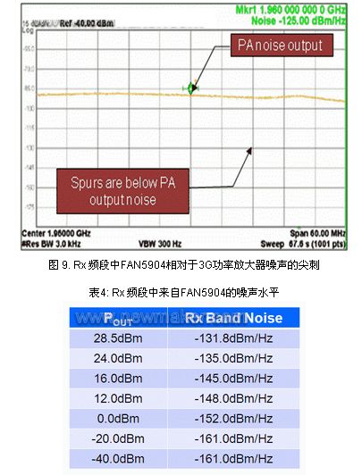 為了進(jìn)一步了解降壓轉(zhuǎn)換器帶來的噪聲/尖刺情況,根據(jù)3G功率放大器自身的噪聲輸出,對接收頻段內(nèi)的噪聲進(jìn)行了測量和比較。圖9顯示在28.5dBm的最高輸出功率下,來自FAN5904的尖刺水平實(shí)際上遠(yuǎn)遠(yuǎn)低于功率放大器的噪聲水平,表4顯示,來自FAN5904 的噪聲在-131.8dBm/Hz處最大,但仍然遠(yuǎn)遠(yuǎn)低于功率放大器自身的-90dBc。RF工程師可以放心,F(xiàn)AN5904在PWM和PFM模式工作時(shí)不會對蜂窩和其它RF頻譜的發(fā)送和接收頻段造成干擾。