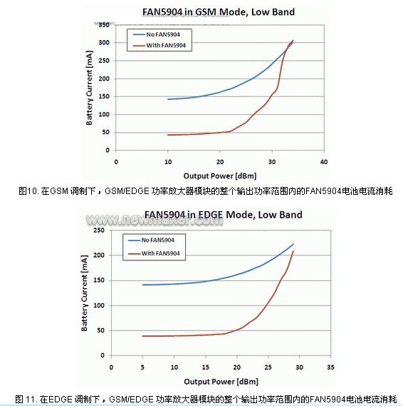 最后一個(gè)重要特性是,F(xiàn)AN5904控制GSM/EDGE功率放大器模塊的能力在于將RF功率管理解決方案從 FAN5904分離出來。在GSM/EDGE模式下,F(xiàn)AN5904具有3A的設(shè)計(jì)峰值極限電流,因而能夠控制電流高達(dá)2A的功率放大器模塊。在GSM /EDGE模式下,由于電流負(fù)載更大,F(xiàn)AN5904總是以PWM方式工作,因?yàn)镚SM和EDGE信號較3G信號具有更高的輸出功率水平,因此它以 3MHz的頻率進(jìn)行開關(guān)。3MHz是合適的開關(guān)頻率,因?yàn)樗挥赪CDMA通道帶寬之外,但是仍然可以使用小電感和小電容來處理更大電流負(fù)載,并使效率維持在高達(dá)95%的水平。人們可能要問,為什么在該模式下不使用6MHz,這在設(shè)計(jì)上是不可行的,因?yàn)檩^大的電流負(fù)載會使開關(guān)損耗更高,小型化解決方案帶來的好處在效率方面得不到補(bǔ)償。圖10和圖11顯示,在蜂窩設(shè)備處于GSM或EDGE模式下,使用FAN5904可將電流降低100mA。