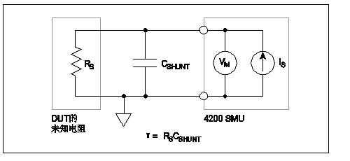 測量電路的建立時間在測量小電流和高電阻時尤其重要。建立時間是指施加或改變電流或電壓后測量達到穩(wěn)定的時間。影響測量電路建立時間的因素包括并聯(lián)電容(CSHUNT)和源電阻(RS)。并聯(lián)電容是由于連接電纜、測試夾具、開關和探針造成的。DUT的源電阻越高,建立時間越長。圖6的測量電路中標出了并聯(lián)電容和源電阻。