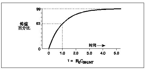 因此,讀數(shù)穩(wěn)定至最終值的1%所需的建立時間為τ的5倍,也就是50秒。圖7所示為RC電路的階躍電壓指數(shù)響應。經(jīng)過一個時間常數(shù)(τ = RC)后,電壓上升至最終值的63%。