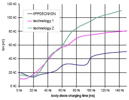 對于優(yōu)化能效,MOSFET內(nèi)部的體二極管具有關(guān)鍵作用。在每個開關(guān)循環(huán)中,在MOSFET被關(guān)斷之前,體二極管通常會通電,反向恢復(fù)電荷Qrr*也由此積聚起來。在第3節(jié)中已經(jīng)提到,數(shù)據(jù)手冊中所載Qrr與實際Qrr*有所出入。數(shù)據(jù)手冊中的值是按di/dt為100 A/μs測得的,二極管被施以最高漏極電流,并且MOSFET關(guān)斷前的導(dǎo)通時間長達(dá)500 μs左右甚至更長。因此,所測得的值是盡可能最高的Qrr*。此外,JEDEC標(biāo)準(zhǔn)所規(guī)定的測定方法不僅包含了Qrr*,而且包含MOSFET的部分輸出電荷,因而得到的總值很高,與實際值不相符。需要強(qiáng)調(diào)的是,雖然在實際應(yīng)用中,di/dt可能高達(dá)1000 A/μs,并且di/dt越高,Qrr*也越高。但是,Qrr*主要取決于電流和二極管導(dǎo)通時間。由于在實際應(yīng)用中,電流僅為最高漏極電流的一半甚或更低,并且二極管導(dǎo)通時間僅為50 ns至150 ns,因此實際Qrr*值比數(shù)據(jù)手冊中的值低得多。