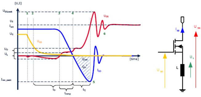 分析首先從開關(guān)的導(dǎo)通狀態(tài)開始:此時,柵極電壓很高,漏源電壓幾乎為零,電流從源極流向漏極。在點1時,柵極被關(guān)斷。在UDS波形中,這表現(xiàn)為柵極電容CG放電產(chǎn)生的負(fù)電壓驟降很小。此放電會在MOSFET的源極連接處產(chǎn)生具有大的電流變化(di/dt)的電流峰值。在感應(yīng)作用下,源極的這種電感會引起UDS波形發(fā)生壓降。
