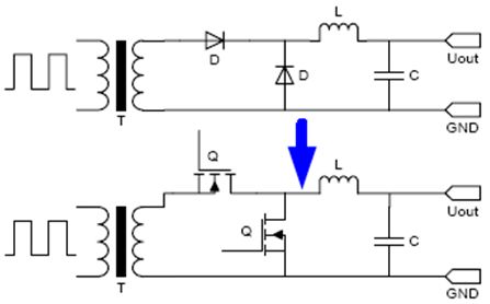 隨便看一個開關(guān)電源,你都可以在電源轉(zhuǎn)換器的二次側(cè)發(fā)現(xiàn)一個整流級。整流級的任務(wù)是對經(jīng)由變壓器從SMPS的一次側(cè)轉(zhuǎn)移至二次側(cè)的方波電源信號進(jìn)行整流。SMPS通常利用功率二極管來實現(xiàn)整流(請參見圖1)。但是,功率二極管具有0.5 V乃至更高的正向壓降,并且會產(chǎn)生較高輸出電流,因此會造成嚴(yán)重的導(dǎo)通損耗,從而大大影響整個電源轉(zhuǎn)換器的能效。為了最大限度地降低這些整流損耗,可以利用最新功率MOSFET來代替二極管。最新的功率MOSFET能夠大幅降低導(dǎo)通損耗,特別是在輸出電流較高的情況下。在考慮低負(fù)載效率時,關(guān)注的焦點不是導(dǎo)通損耗,而是開關(guān)損耗。因為相比于二極管,MOSFET的開關(guān)損耗高得多。對系統(tǒng)能效的其他重要影響來自柵極驅(qū)動和旨在遏制關(guān)斷過程中的過電壓尖峰的緩沖網(wǎng)絡(luò)。這是一個十分復(fù)雜的系統(tǒng),因此,必須深刻理解所有參數(shù)相互之間的關(guān)系,才能優(yōu)化系統(tǒng)能效。