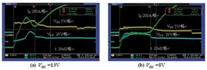 在不同的柵級(jí)電壓下測量短路電流,測試波形如圖2所示,采用的功率MOSFET為AOT266。圖2(a):VGS電壓為13V,短路電流達(dá)1000A,MOSFET在經(jīng)過47μs后電流失控而損壞;圖2(b):VGS電壓為8V,短路電流僅為500A,MOSFET在經(jīng)過68μs后電流失控而損壞。電流測試使用了20:1的電流互感器,因此電流為200A/格。
