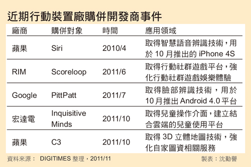 移動(dòng)裝置市場(chǎng)競(jìng)爭(zhēng)激烈,蘋果、Google、宏達(dá)電等大廠為凸顯產(chǎn)品獨(dú)特性,購(gòu)并開(kāi)發(fā)商成為重要布局。