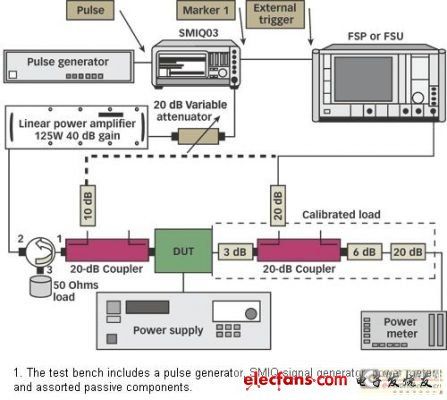 測(cè)試臺(tái)(圖1)使用一個(gè)與SMIQ RF信號(hào)發(fā)生器“脈沖”輸入相連接的脈沖發(fā)生器。為了在功率掃描模式中使用SMIQ,功率掃描必須與信號(hào)分析器中的時(shí)基掃描同步。幸好,當(dāng)與二極管檢測(cè)器和類似XY模式濾波鏡的顯示器相關(guān)聯(lián)時(shí),這一類信號(hào)發(fā)生器具有可以被用作純量網(wǎng)絡(luò)分析儀(SNA)的特性。在SMIQ的后部面板上,有幾個(gè)帶有功率掃描斜線以驅(qū)動(dòng)濾波鏡的X軸的BNC連接器,以及校準(zhǔn)顯示器X軸的標(biāo)記。既然這樣,“標(biāo)記”的輸出被當(dāng)作信號(hào)分析器的觸發(fā)信號(hào)來(lái)使用。