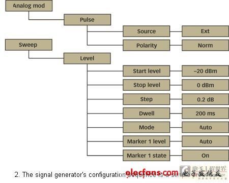 確定所有參數(shù)以便DUT的電流消耗不會(huì)偏離靜態(tài)電流,從而確保穩(wěn)定的熱反應(yīng)。信號(hào)發(fā)生器通過(guò)選擇模擬調(diào)制清單上的脈沖可選項(xiàng)轉(zhuǎn)換為脈沖模式。在掃描清單中,選擇功率掃描模式。開始等級(jí)被設(shè)置為-20dBm,停止等級(jí)設(shè)置為0dBm。0.2dB的步長(zhǎng)可有101個(gè)測(cè)量點(diǎn)。必須小心選擇停頓時(shí)間。如果選擇的值太小,在功率掃描期間可能出現(xiàn)的瞬變會(huì)導(dǎo)致DUT損耗的電流與靜態(tài)電流偏離。在保持20s的適當(dāng)短暫掃描時(shí)間時(shí),200ms的停頓時(shí)間可以忽略其影響。同一個(gè)清單上,標(biāo)志1被設(shè)為掃描的開始值,即-20dBm,由選擇“開”狀態(tài)激活。圖2顯示了詳細(xì)的配置序列。